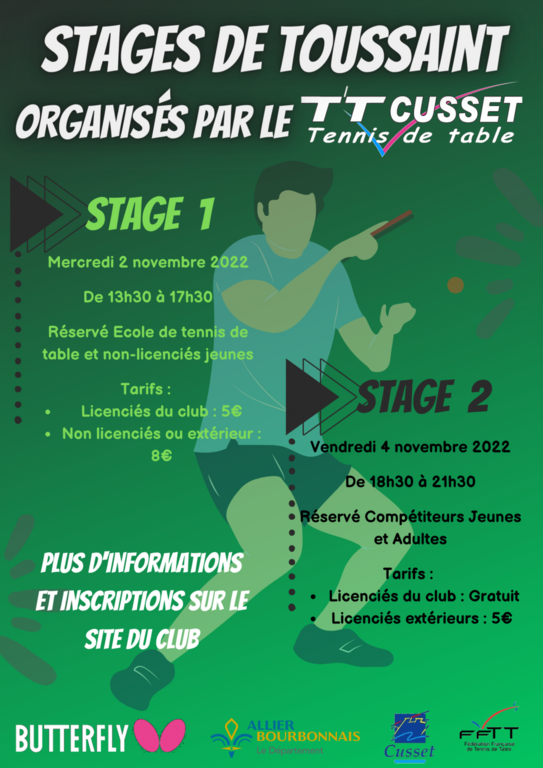 Le club propose un stage de tennis de table pendant les vacances de Toussaint, réservé aux compétiteurs adultes et jeunes.