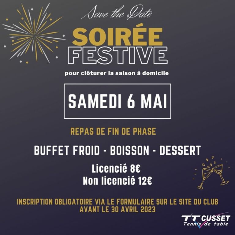 Le club organise, le samedi 6 mai à partir de 20h, une soirée festive à l'occasion de la dernière à domicile de la saison pour la plupart des équipes. Il sera l'occasion de fêter la fin du championnat (un peu avant l'heure) avec on l'espère des résultats positifs pour nos équipes (4 équipes sur 5 jouent la montée au niveau supérieur).
