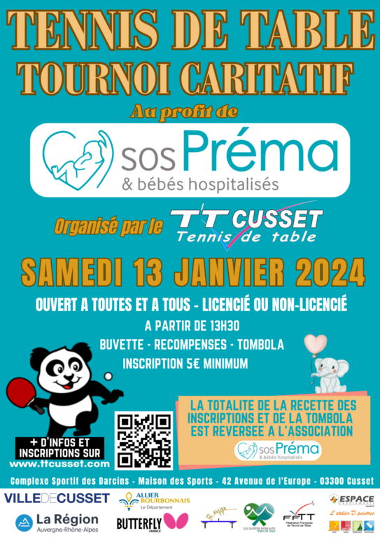 Le club de tennis de table de Cusset est heureux d'organiser son premier tournoi caritatif au profit d'une association, ouvert à tous, licencié(e)s et non-licencié(e)s.