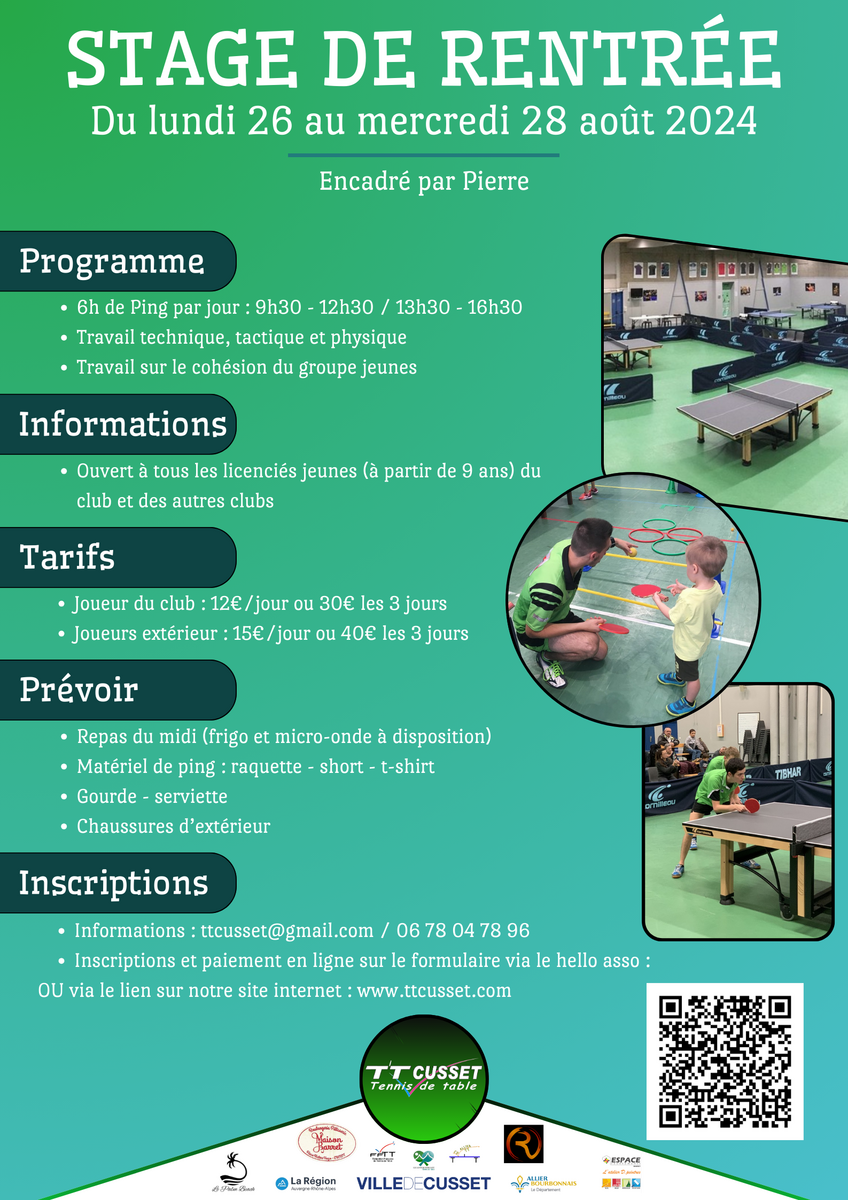 Inscriptions et paiement en ligne via le formulaire sur Hello Asso en cliquant sur le lien ci-dessous : https://www.helloasso.com/associations/tennis-de-table-de-cusset/evenements/stage-sportif