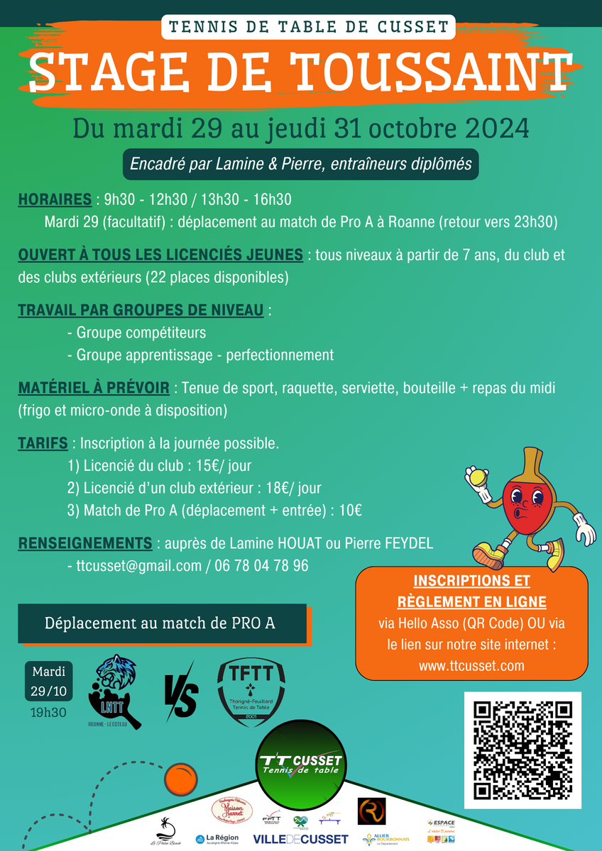 Le club organise un stage durant les vacances scolaires de Toussaint du mardi 29 au jeudi 31 octobre 2024. Ce stage est ouvert à tous les licenciés jeunes compétiteurs ET école de tennis de table (à partir de 7 ans) du club et des autres clubs.