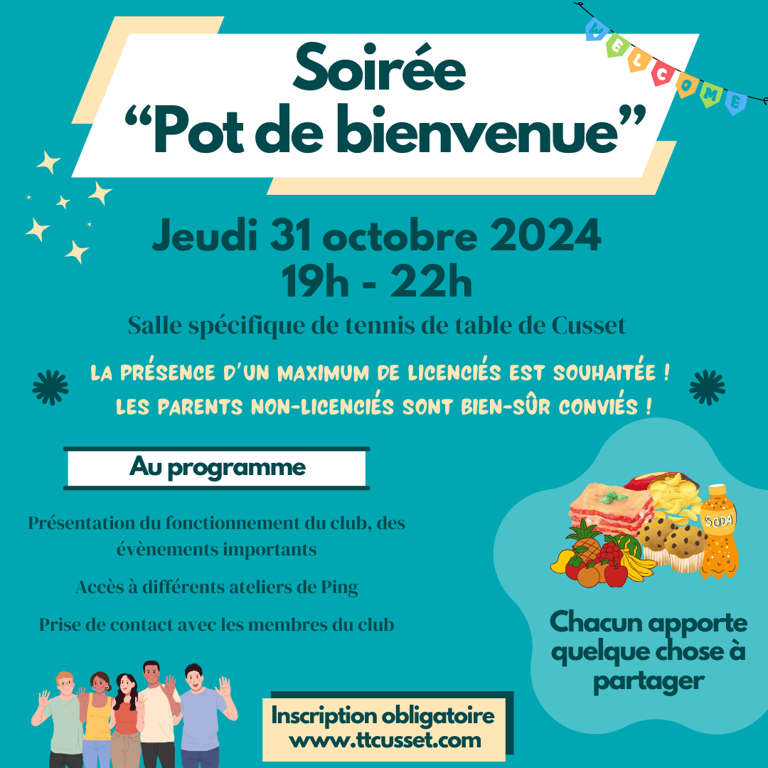 Le tennis de table de Cusset organise, le jeudi 31 octobre 2024 - de 19h à 22h, une soirée festive et conviviale "Pot de bienvenue".