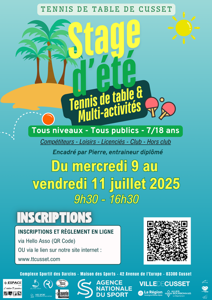 Le club organise un stage multi-activités durant les vacances scolaires d'été du mercredi 9 au vendredi 11 juillet 2025. Ce stage est ouvert à tous les licenciés jeunes compétiteurs ET école de tennis de table (à partir de 7 ans) du club et des autres clubs.