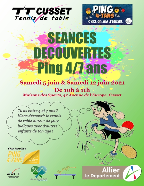 Le club propose deux séances de découverte du tennis de table pour les enfants de 4 à 7 ans :