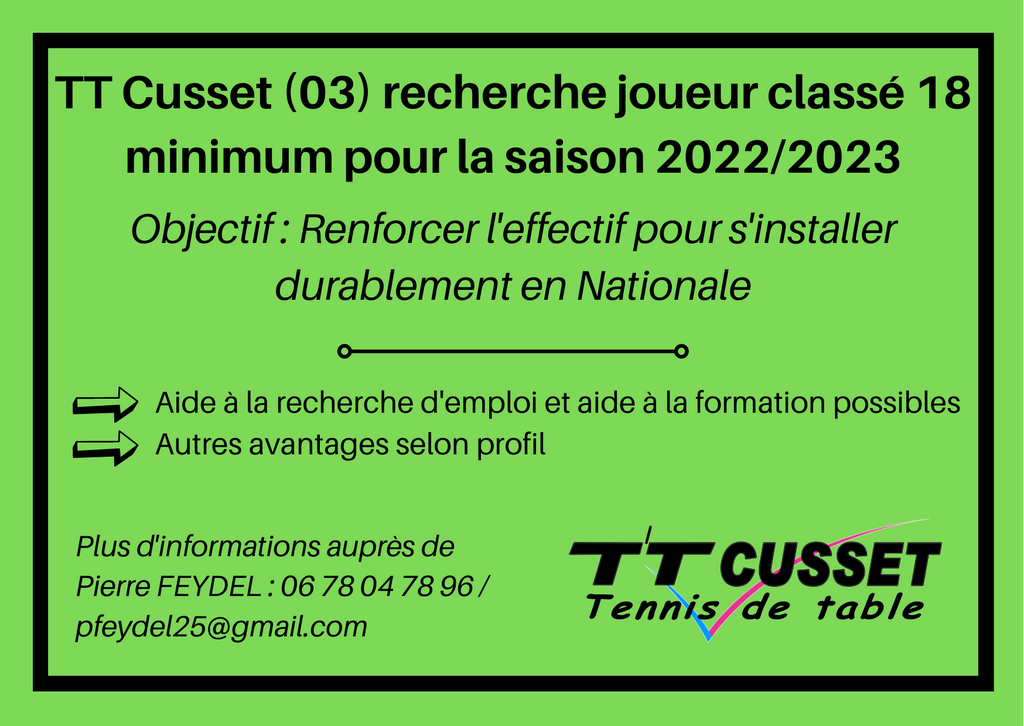 Le club recherche un joueur classé 18 minimum pour compléter l'effectif de l'équipe fanion en Pré-Nationale avec objectif de remonter en Nationale 3.