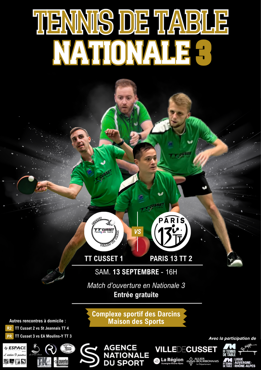 Ce 𝘀𝗮𝗺𝗲𝗱𝗶 𝟭𝟯 𝘀𝗲𝗽𝘁𝗲𝗺𝗯𝗿𝗲, notre équipe fanion débute sa saison de 𝗡𝗮𝘁𝗶𝗼𝗻𝗮𝗹𝗲 𝟯 à la Maison des Sports de Cusset ! Un premier match à enjeu pour démarrer le championnat !