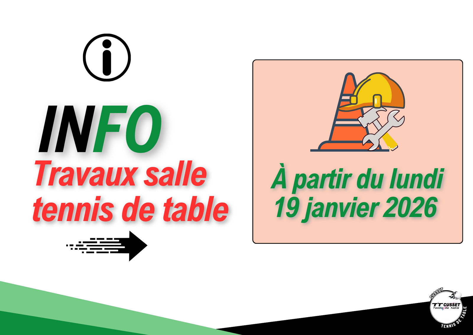 En raison de la réfection de la toiture de la maison des sports, des travaux débuteront dans notre salle de tennis de table à partir de ce lundi 19 janvier 2026, et jusqu'à nouvel ordre.